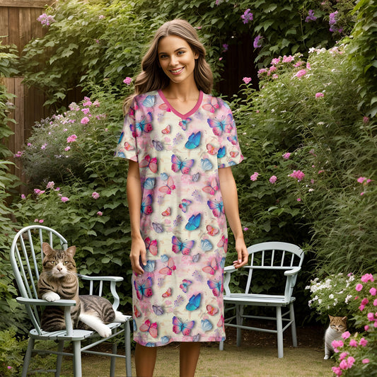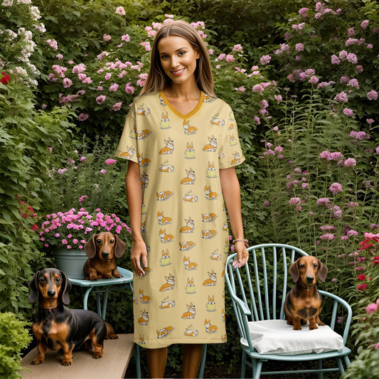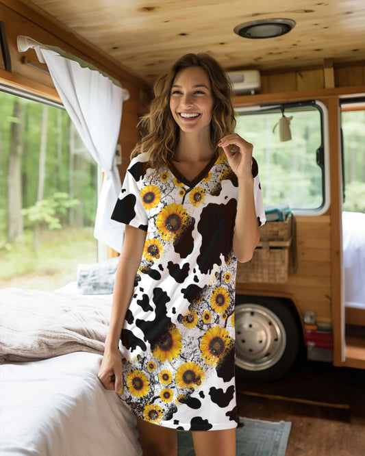 Cow Chickens V-neck Nightshirts Cow Sunflower Pattern