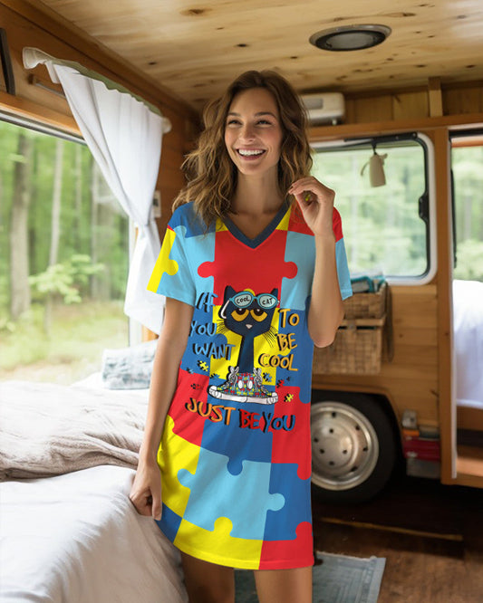 Cute Funny Cat Shineful V-neck Nightshirts Autism Awareness NK07