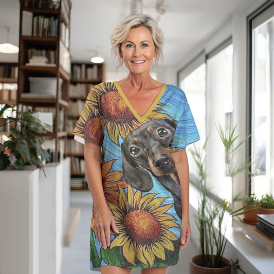Dachshund Shineful V-neck Women's Nightshirts Dachshund With Sunflowers