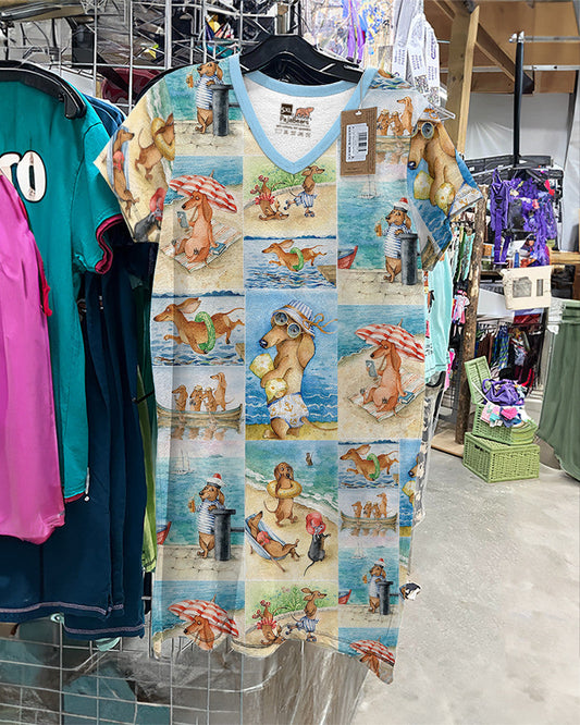 Dachshunds V-neck Nightshirts On The Beach