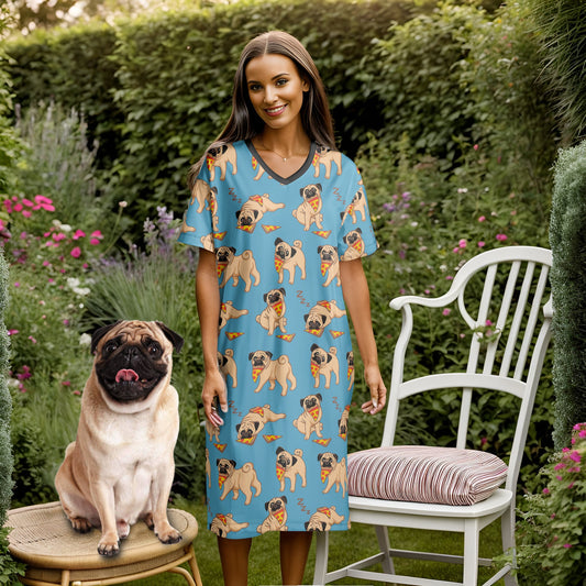 Pugs V-neck Nightshirts Cute Pug Eating Pizza