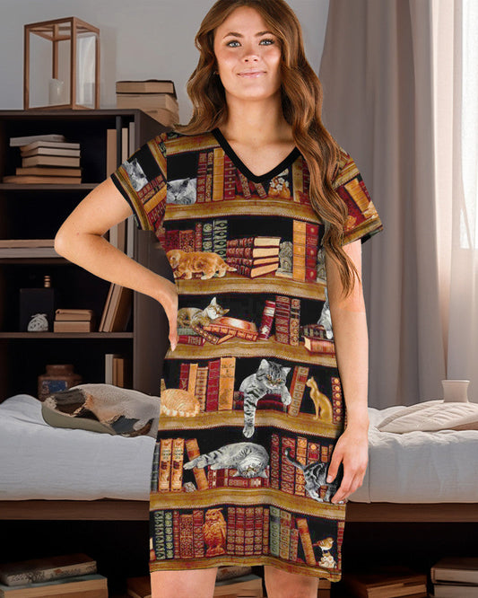 Cat bookshelf V-neck Shineful V-neck Nightshirt