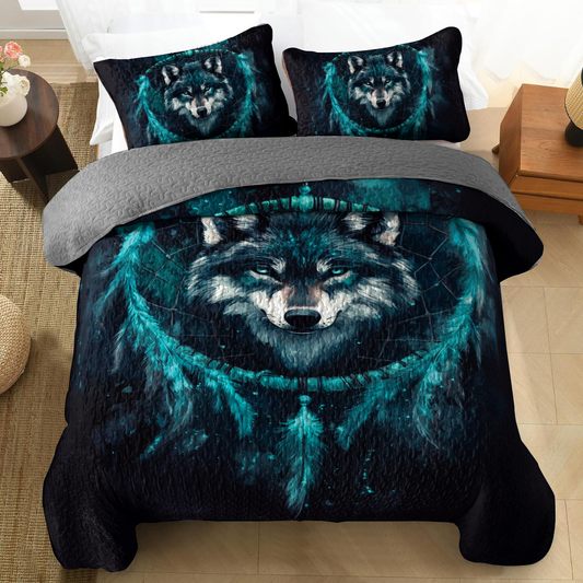 Shineful All Season Quilt 3-Piece Set - Navy Night Wolf Dreamcatcher