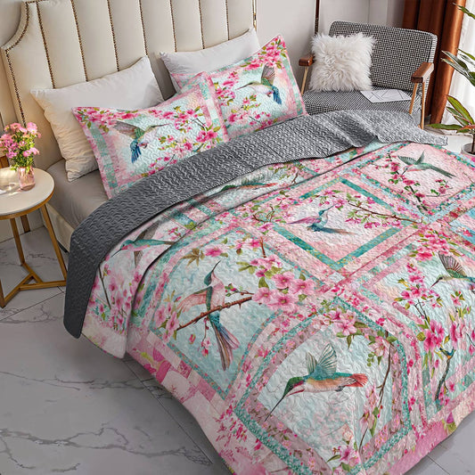 Shineful All Season Quilt 3-Piece Set Hummingbird With Cherry Blossoms Lovely