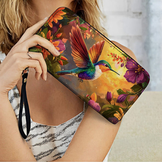 Shineful Leather Clutch Purse With Wristlet Strap Handle Hummingbird Blossom