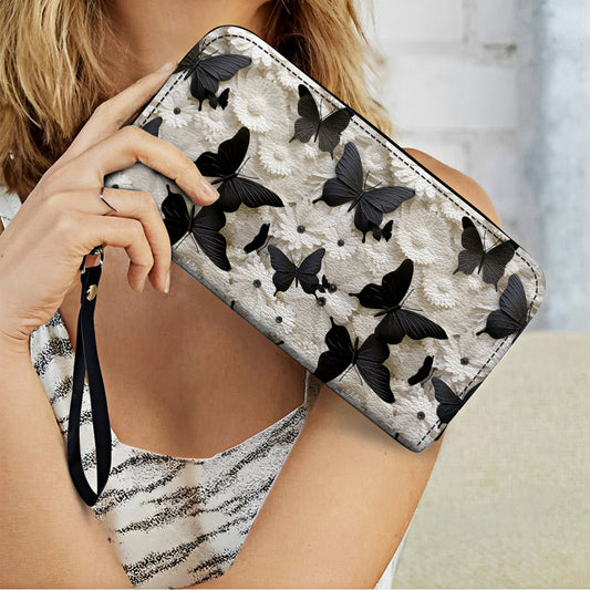 Shineful Leather Clutch Purse With Wristlet Strap Handle Black Butterfly