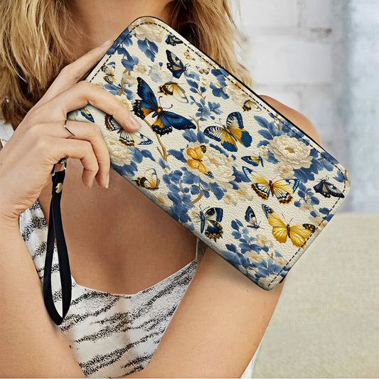 Shineful Leather Clutch Purse With Wristlet Strap Handle Butterfly Garden Royal