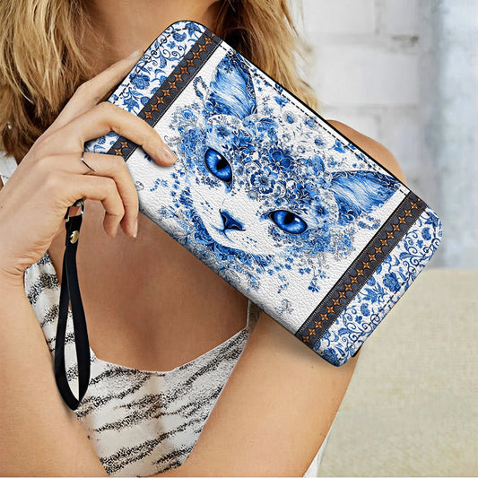Shineful Leather Clutch Purse With Wristlet Strap Handle Blue Beauty Cat