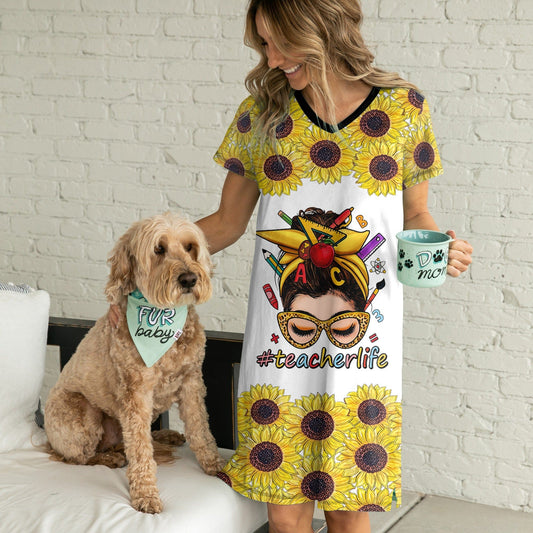 Teachers V-neck Nightshirts Sunflower Teacher Life