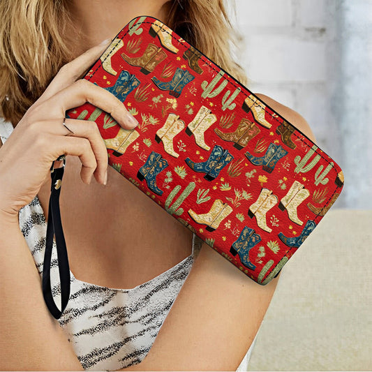 Shineful Leather Clutch Purse With Wristlet Strap Handle Glamorous Cowgirl Boot Pattern