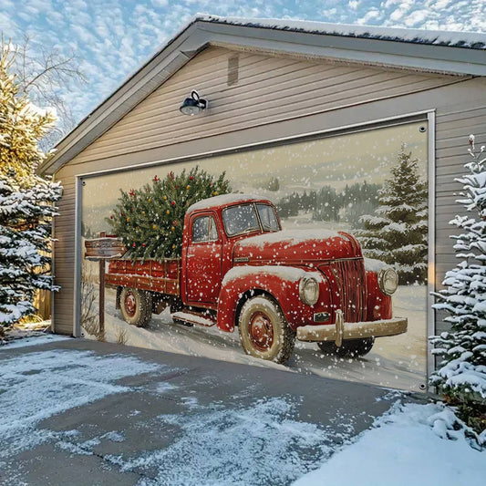 Shineful Garage Door Banner Decoration Santa’s Red Truck and Festive Pines