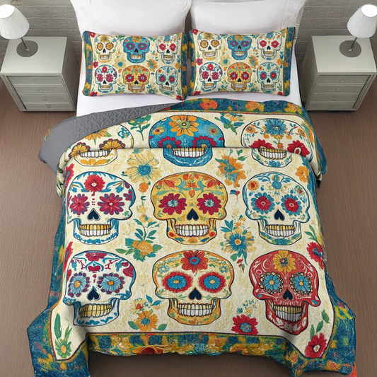 Shineful All Season Quilt 3-Piece Set Floral Skull Dreams Halloween