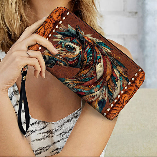 Shineful Leather Clutch Purse With Wristlet Strap Handle Tribal Horse Majesty
