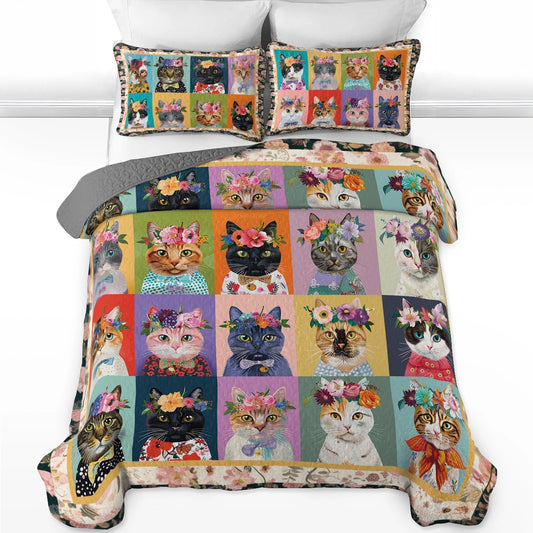 Shineful All Season Quilt 3-Piece Set Floral Cat Fantasy