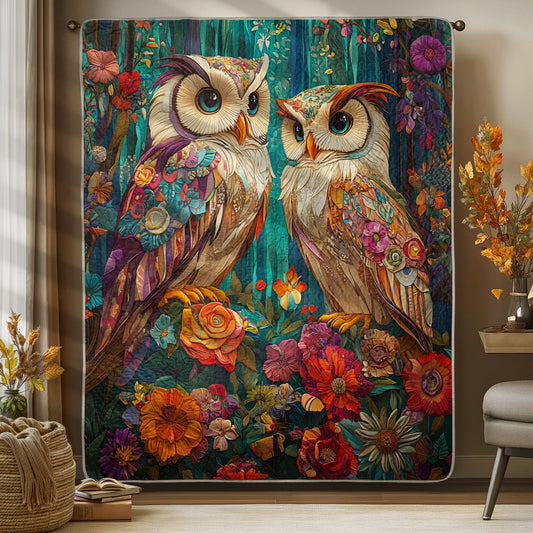 Shineful Flat Print Faux Quilt Blanket - Whimsical Owls Amidst a Kaleidoscope of Forest Blooms