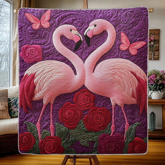 Shineful Flat Print Faux Quilt Blanket - Pink Flamingos in Love with Roses and Butterflies