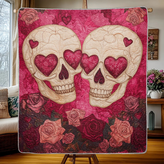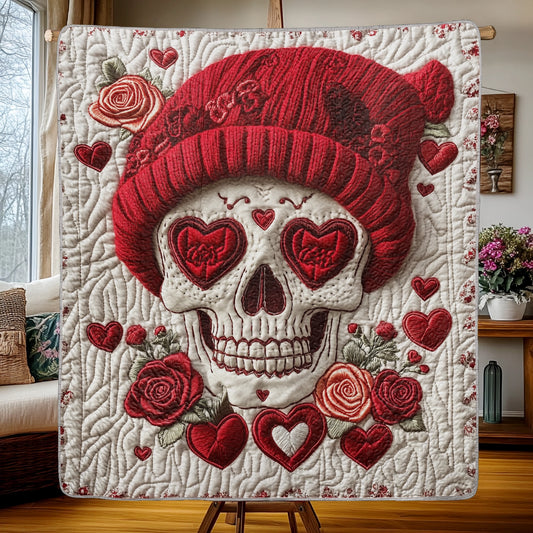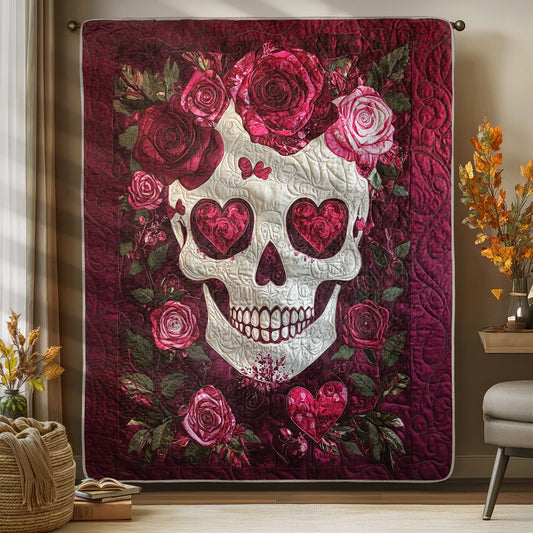Shineful Flat Print Faux Quilt Blanket - Romantic Skull Art with Roses and Heartful Elegance