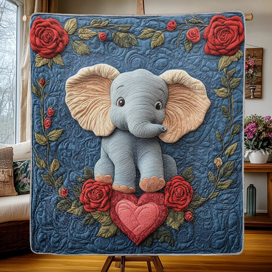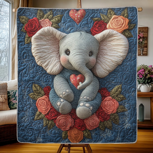 Shineful Flat Print Faux Quilt Blanket - Sweet Baby Elephant with Roses and Heart of Love