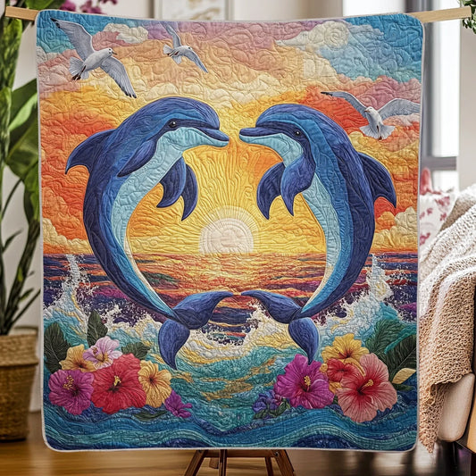 Shineful Flat Print Faux Quilt Blanket - Dolphins Dancing in a Vibrant Sunset Symphony