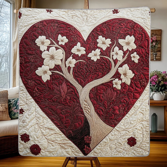 Shineful Flat Print Faux Quilt Blanket - Enchanted Heart Quilt with Floral Tree and Embroidered Accents