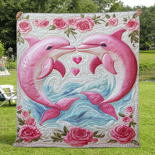 Shineful Flat Print Faux Quilt Blanket - Two Pink Dolphins in Love with Hearts and Roses