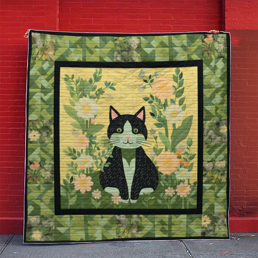 Shineful Flat Print Faux Quilt Blanket Adorable Cats With Flowers