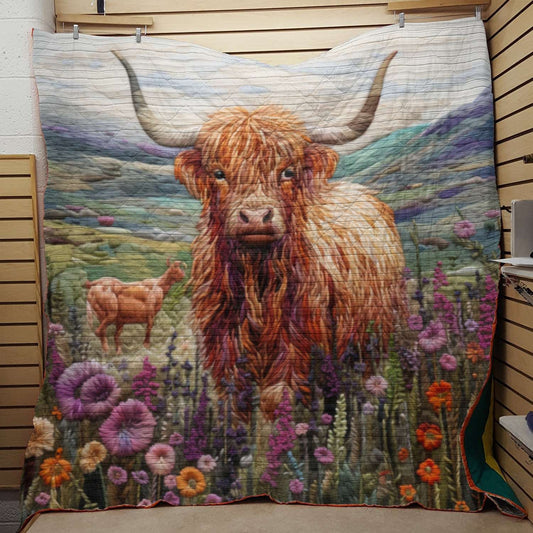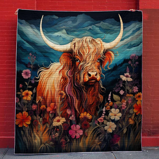 Shineful Flat Print Faux Quilt Blanket Highland Cow On Flower Field V2