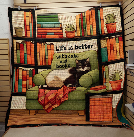 Shineful Flat Print Faux Quilt Blanket Life is better with Cats and Books