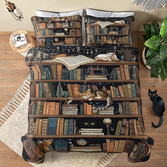 Shineful All Season Quilt 3-Piece Set Purrfect Book Lover Bookshelf