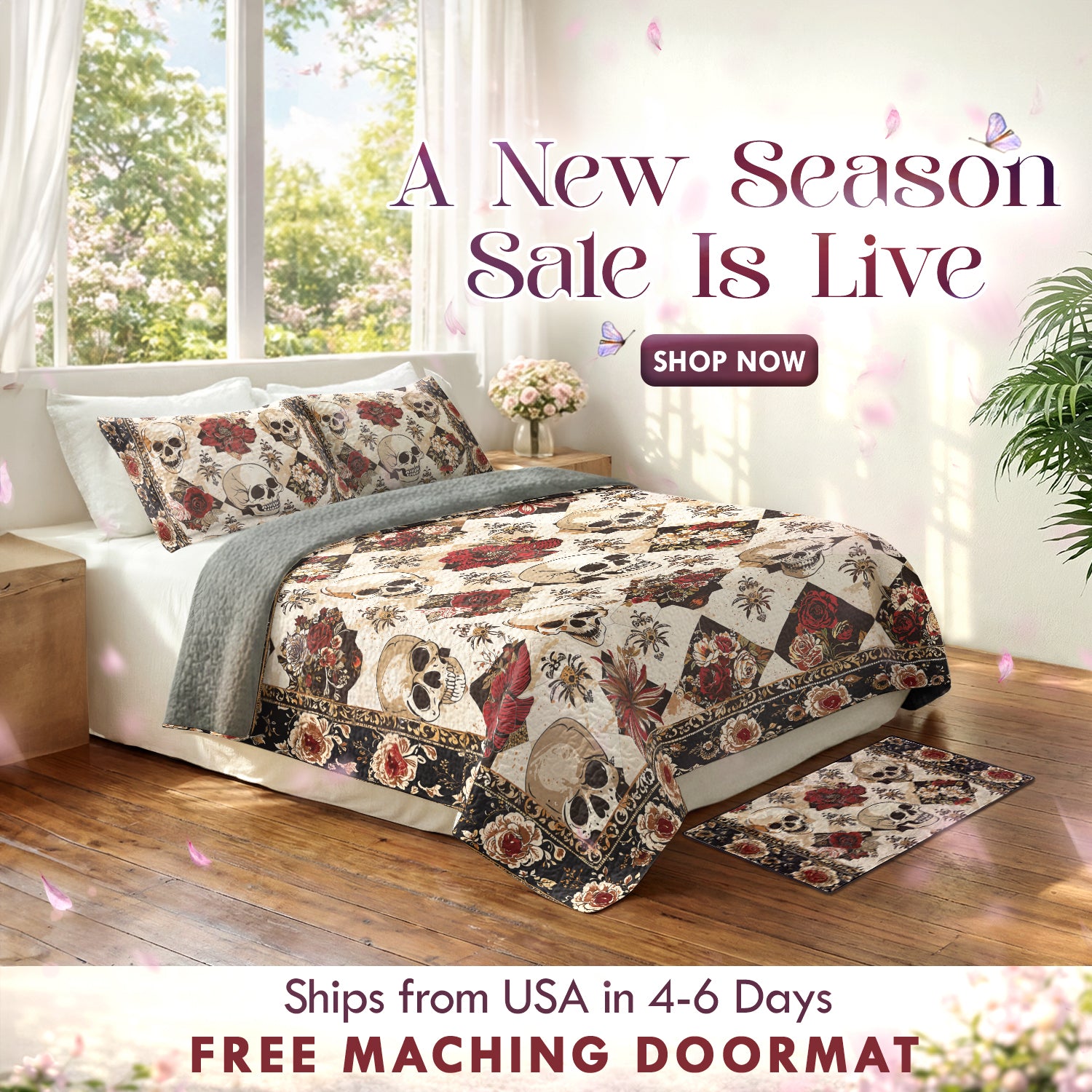 Shineful Quilt 3-Piece Set Elegent Skull Roses