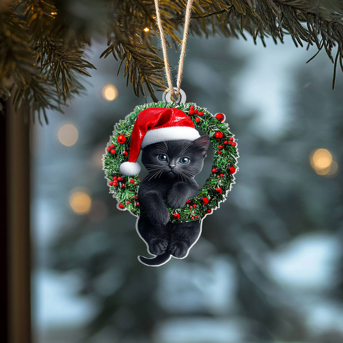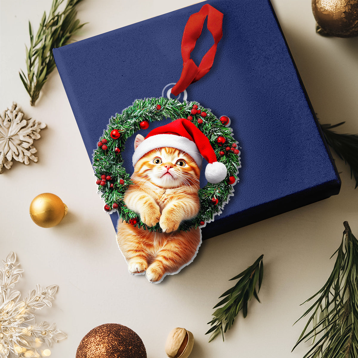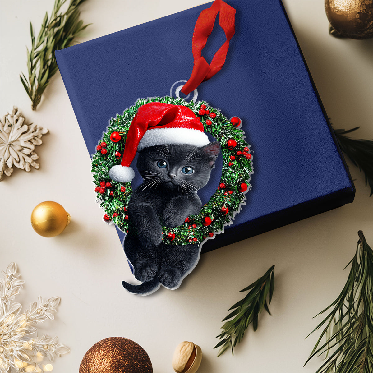 Shineful 2D Acrylic Ornament Naughty Cat With Holly Berry Wreath