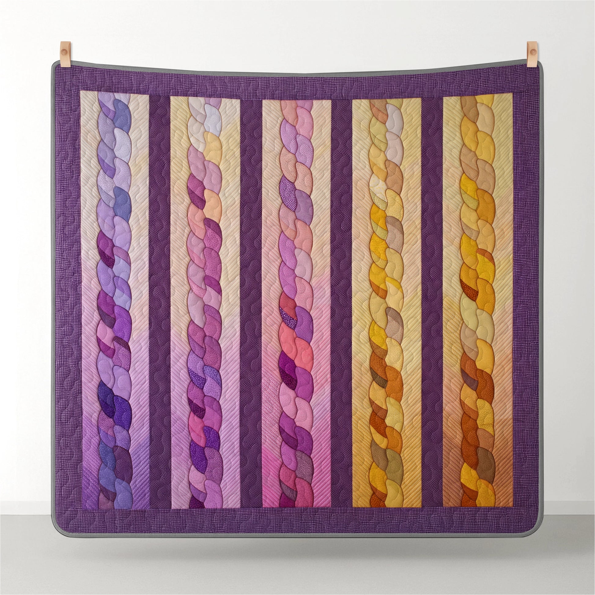 The braided pattern adds depth without heaviness. Light shifts subtly from cool to warm, from muted lavender to sunlit amber, giving the quilt a soothing, almost meditative presence. Nothing feels abrupt—every transition is gradual, intentional, and calm.