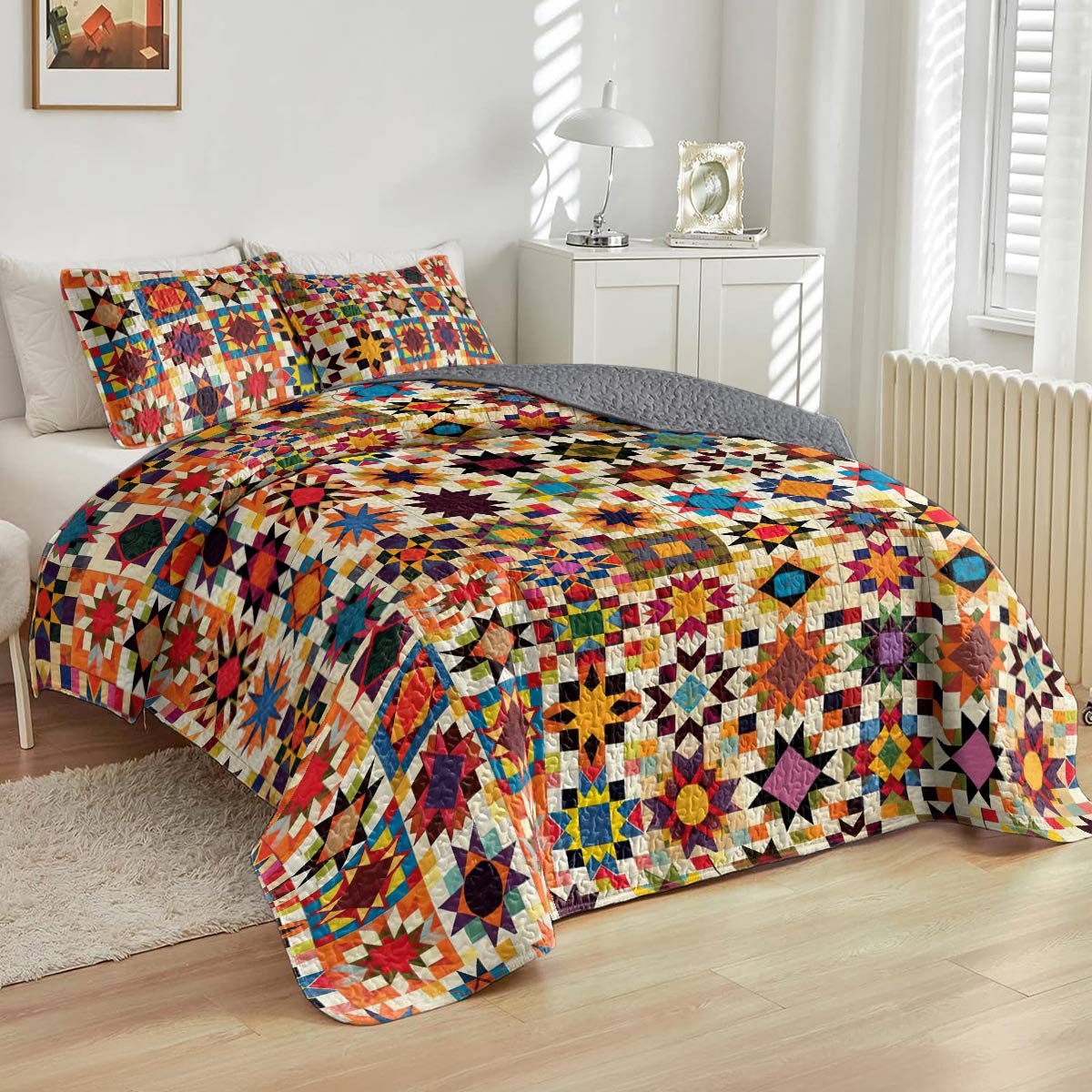 Transform your bedroom into a serene sanctuary with The Shineful Quilt Set. The rich, vibrant colors and unique artworks breathe new life into your space, while adding a touch of personality and timeless elegance. Crafted with attention to detail, each piece invites you to relax in style. This quilt set is more than just bedding—it’s a statement of comfort and sophistication. Let it elevate your bedroom and enhance every moment of rest