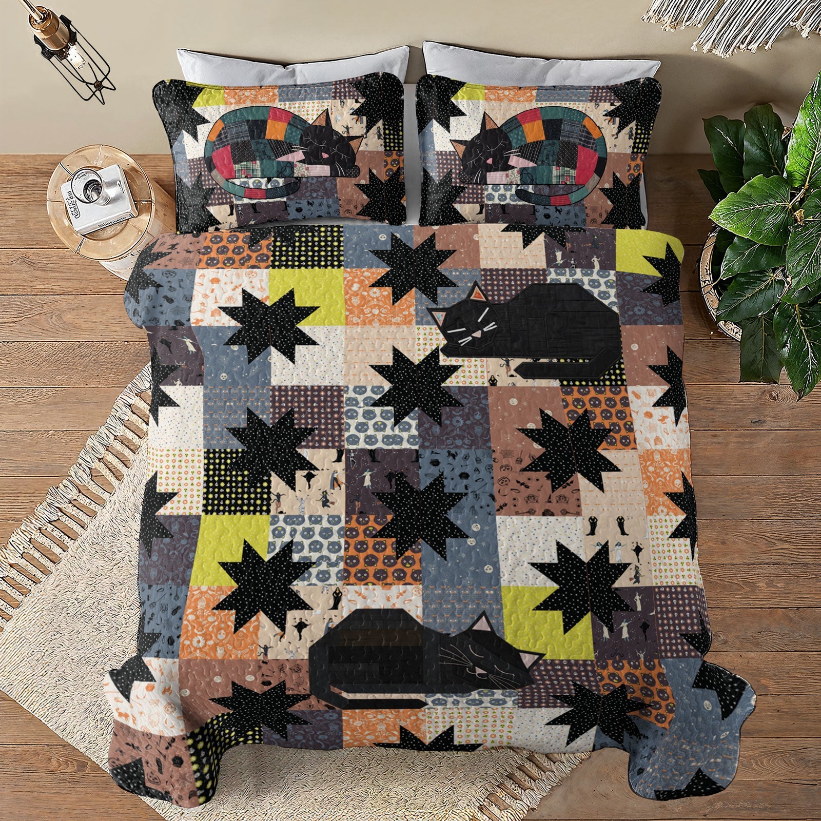 Shineful All Season Quilt 3-Piece Set Star Blocks Sleeping Black Cats
