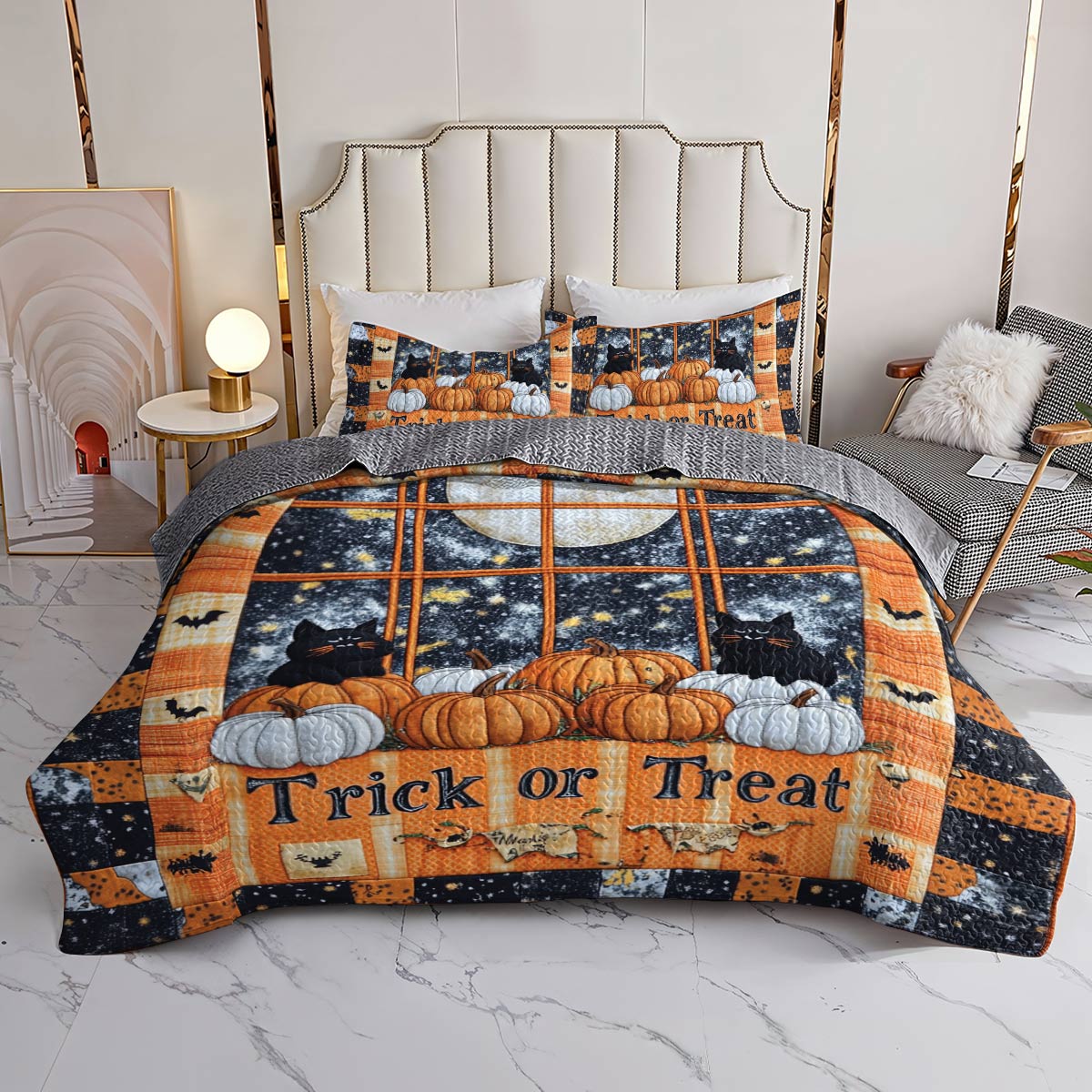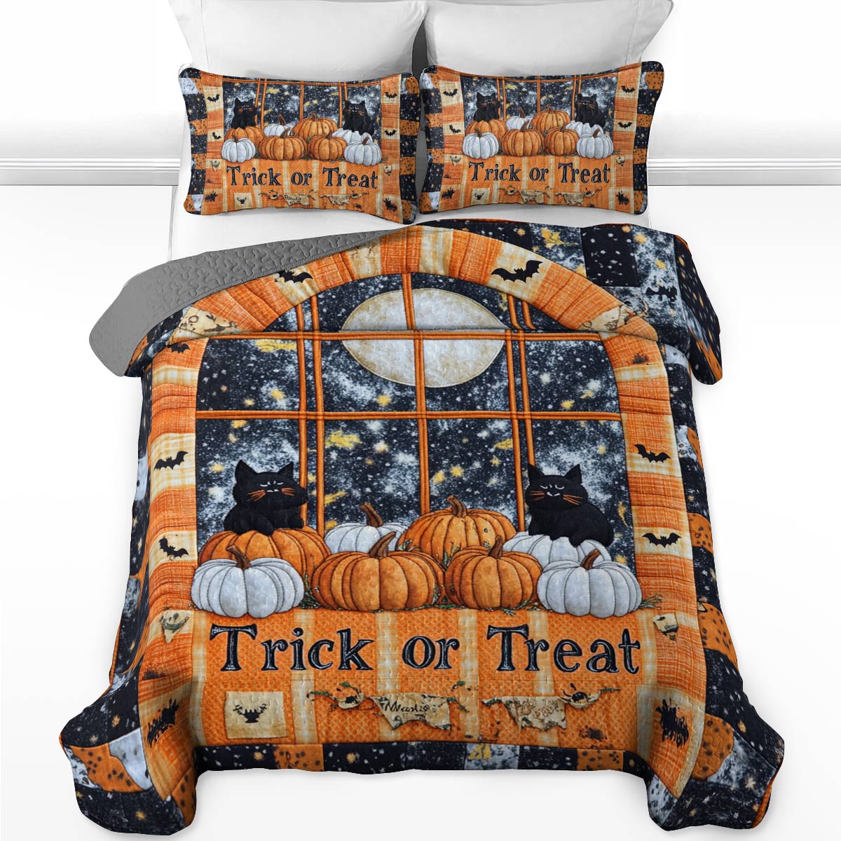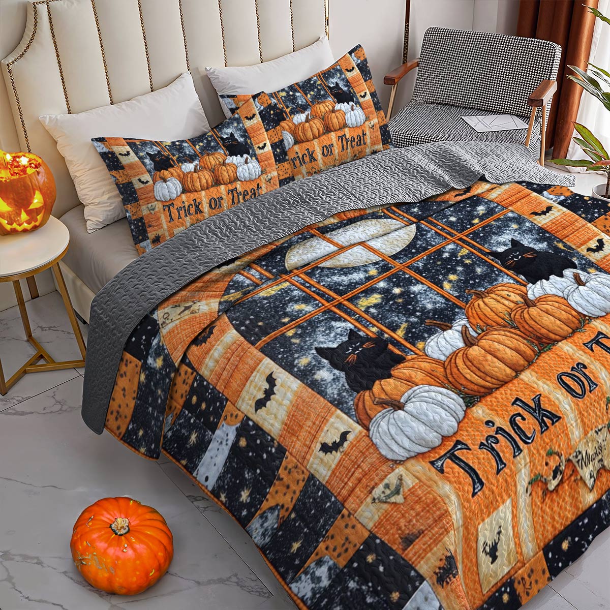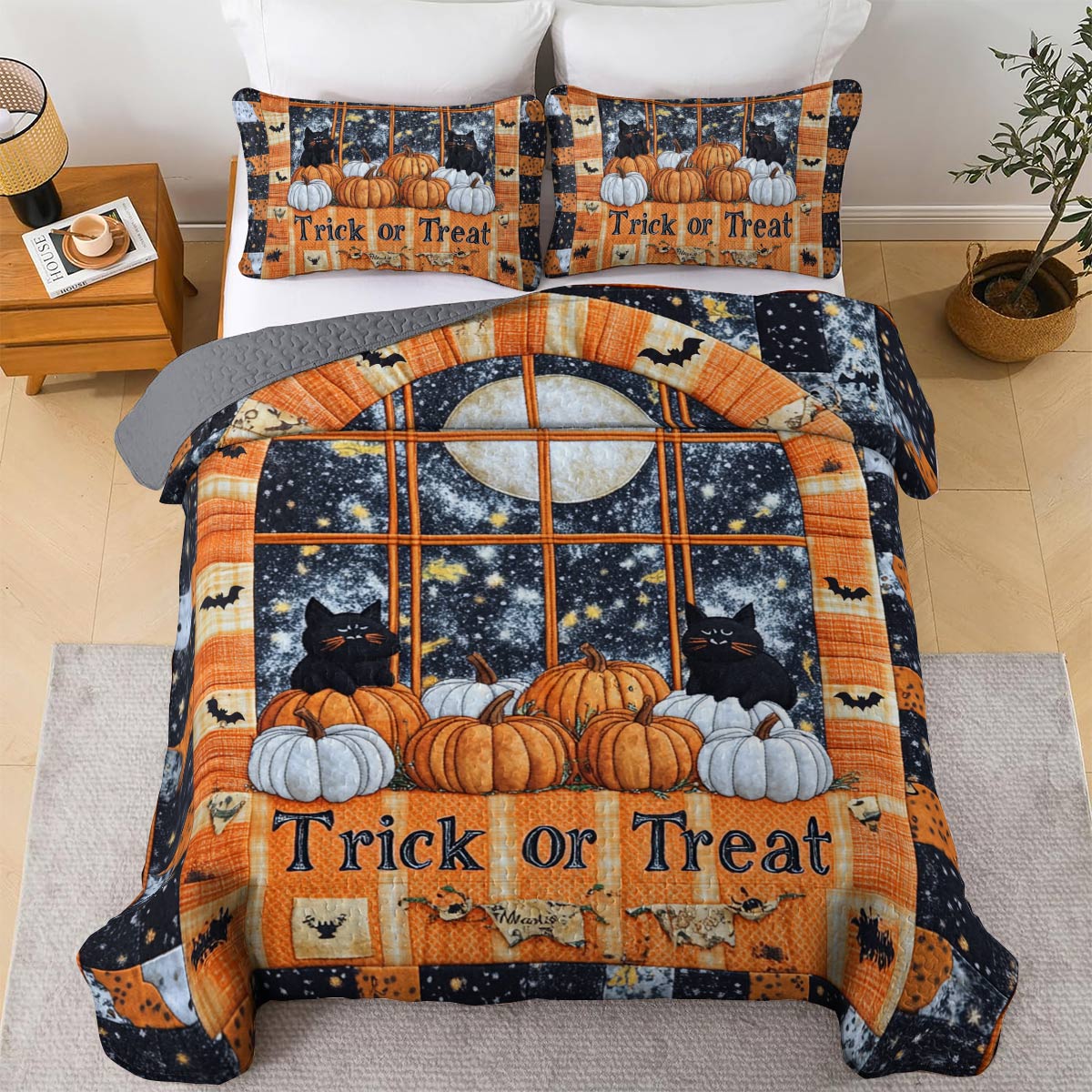 Shineful All Season Quilt 3-Piece Set Cute Fat Black Cats Pumpkins Halloween