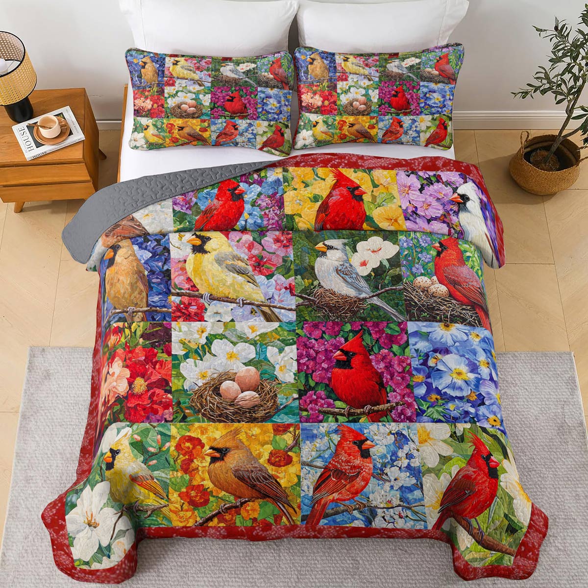 Shineful All Season Quilt 3-Piece Set Gorgeous Cardinals Flowers