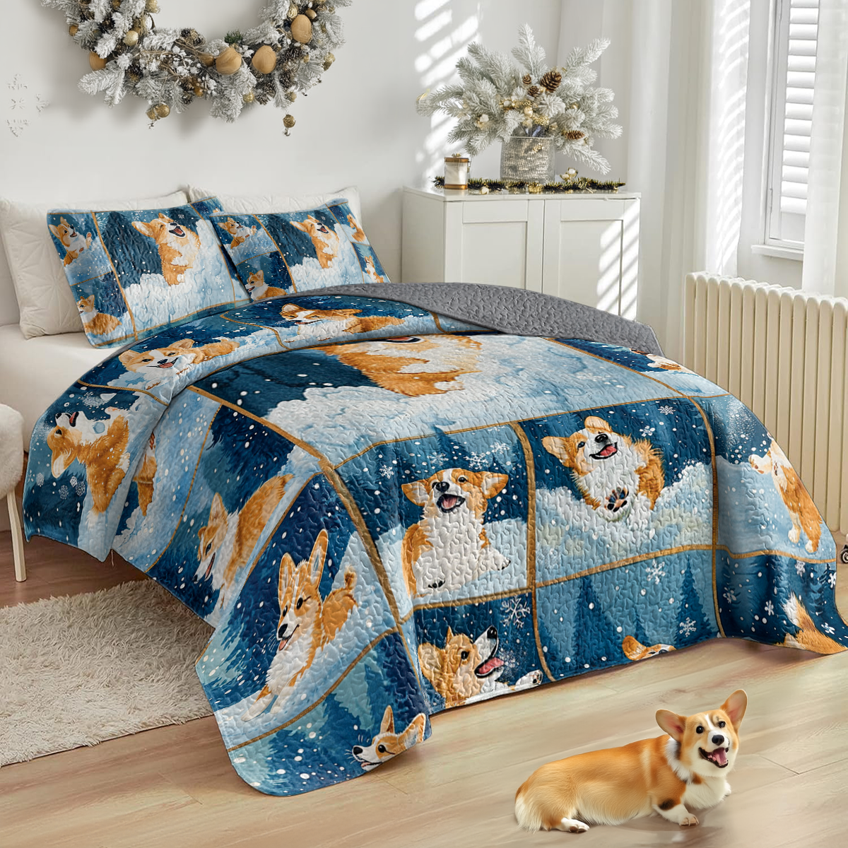 Shineful All Season Quilt 3-Piece Set Happy Snowy Corgi