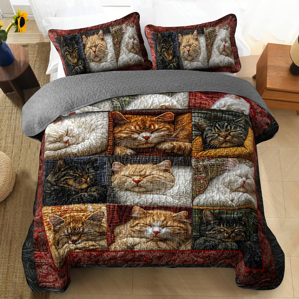 Shineful Flat Print All Season Quilt 3-Piece Set Pretty Snoozing Cats