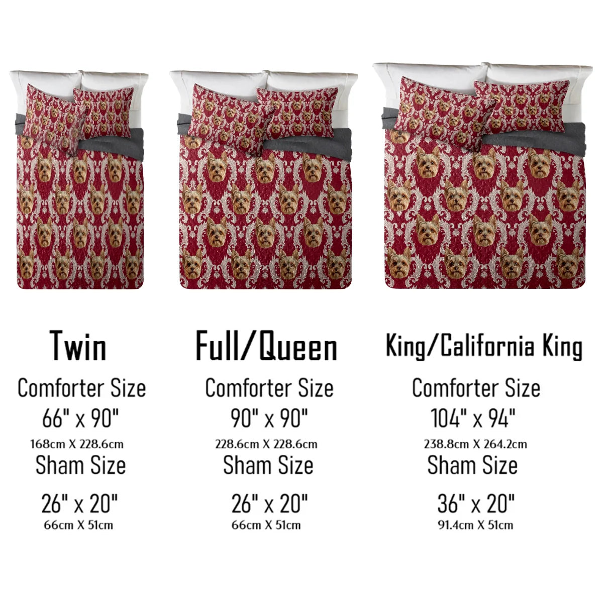 This luxurious quilt set features a regal Yorkshire Terrier pattern, elegantly framed within intricate baroque-style flourishes. The Yorkie’s lifelike expression and finely detailed fur bring warmth and charm to the design. Set against a rich crimson red background, the symmetrical damask-inspired motifs in soft beige add a timeless and sophisticated aesthetic. The striking contrast between the deep red and ornate details enhances the classic elegance of the artwork. Crafted from high-quality, ultra-soft fabric, this quilt set offers both comfort and durability. A perfect choice for Yorkie lovers, it adds a refined and stylish touch to any bedroom, blending artistic beauty with cozy warmth.