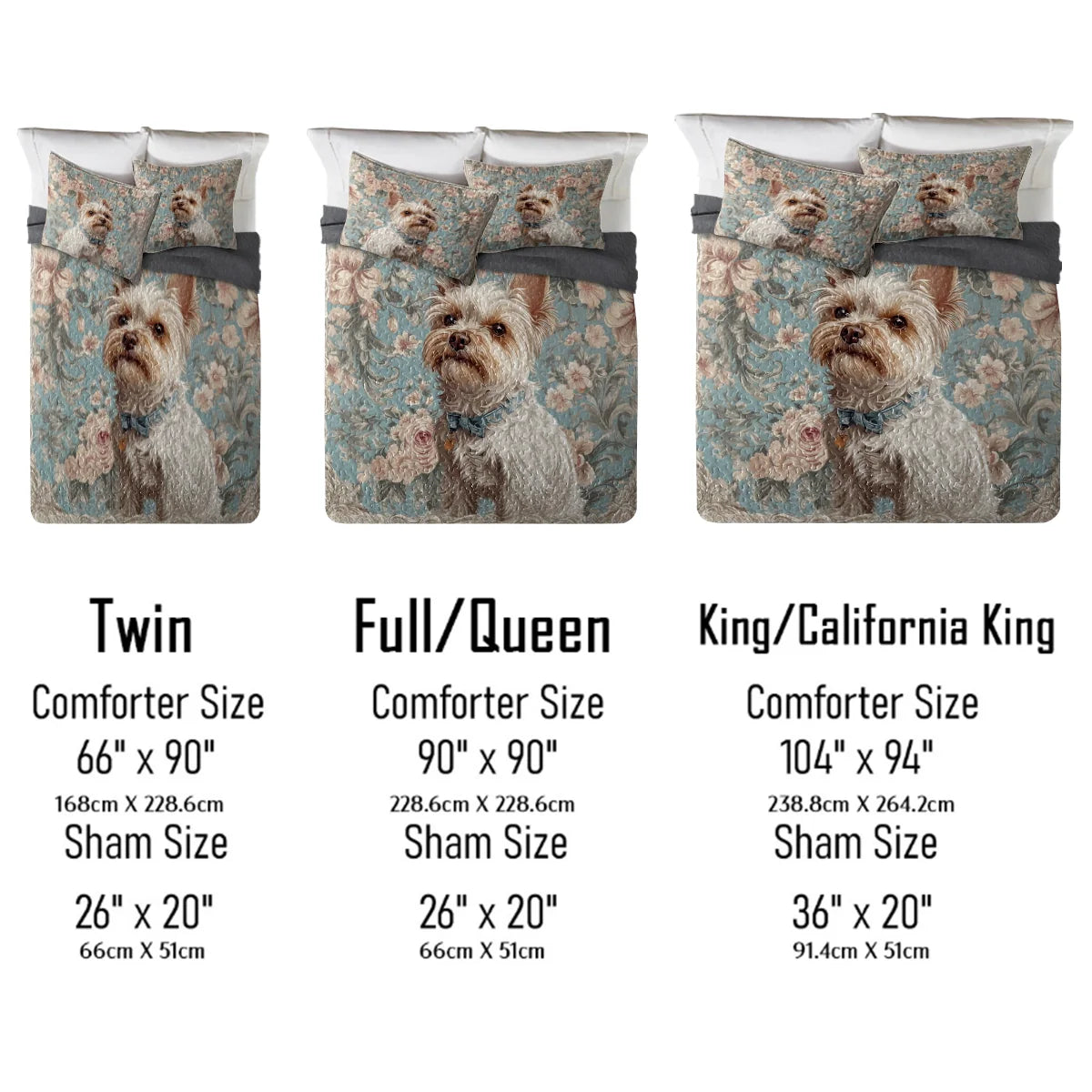 This elegant quilt set features a beautifully detailed Yorkshire Terrier, captured in a regal pose with lifelike fur and expressive eyes. The Yorkie wears a charming blue bow collar, adding a touch of sophistication and personality to the design. Set against a soft blue floral background, delicate roses and swirling foliage in warm beige and ivory tones create a timeless, vintage aesthetic. The intricate baroque-style border enhances the luxurious feel of the artwork, making it a stunning centerpiece. Crafted from high-quality, ultra-soft fabric, this quilt set ensures comfort, warmth, and durability. A perfect addition for Yorkie lovers, it brings elegance, charm, and coziness to any bedroom space.