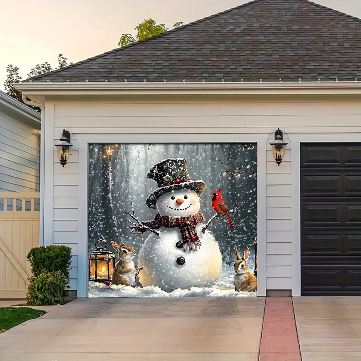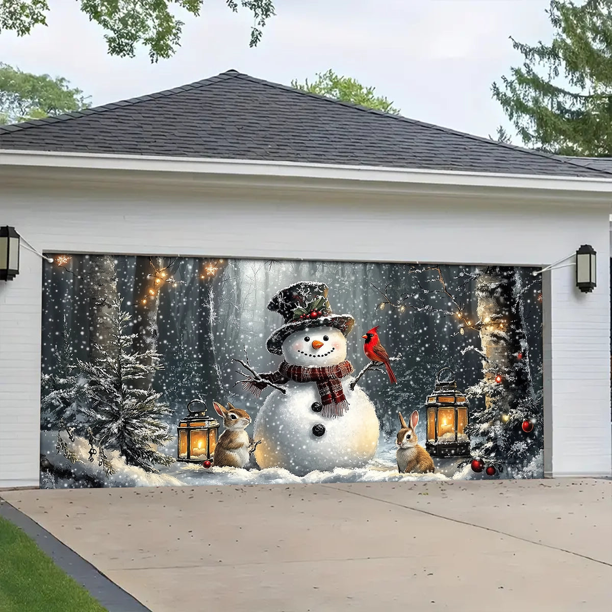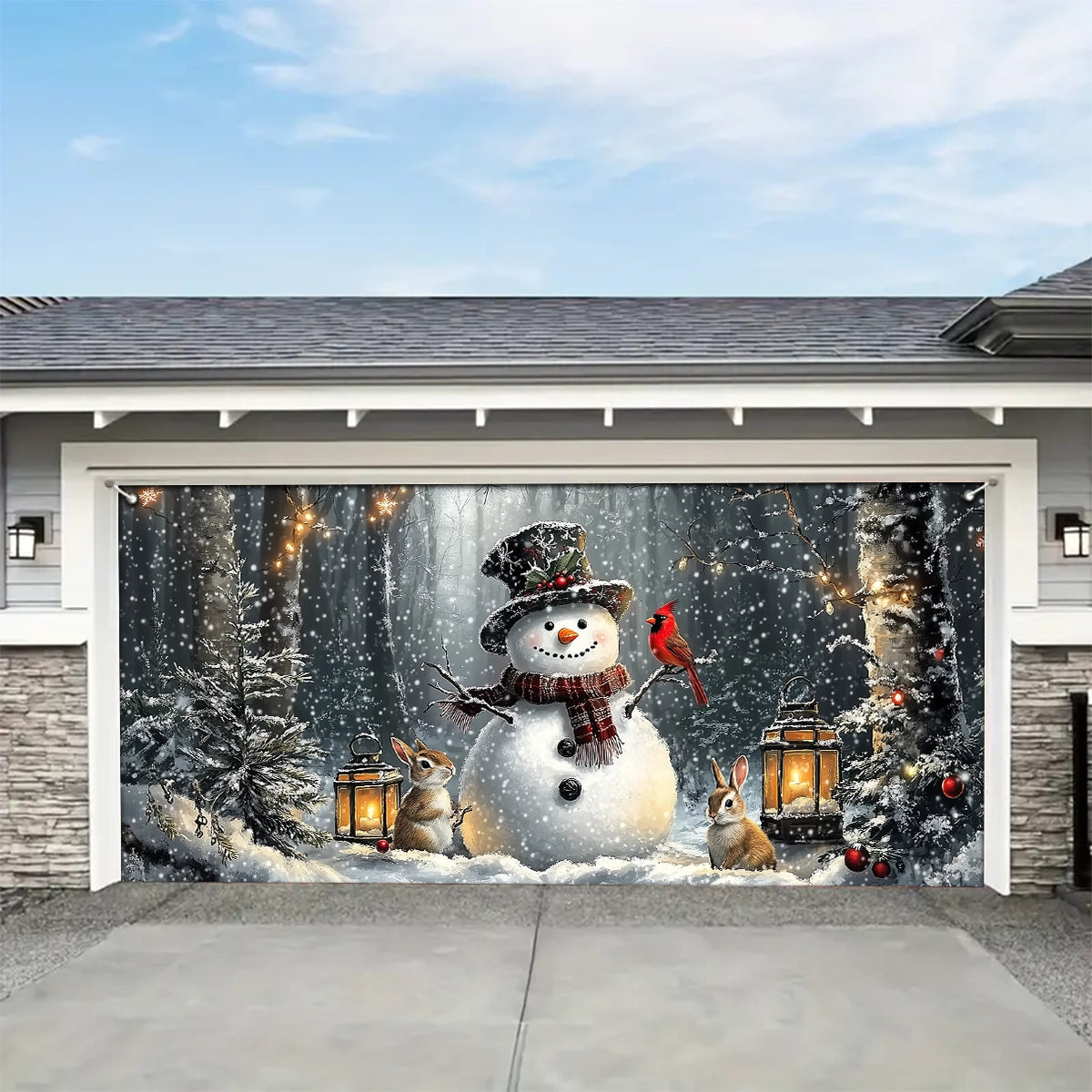 Shineful Garage Door Banner Decoration - Winter Forest Snowman Gathering with Bunnies and Cardinals