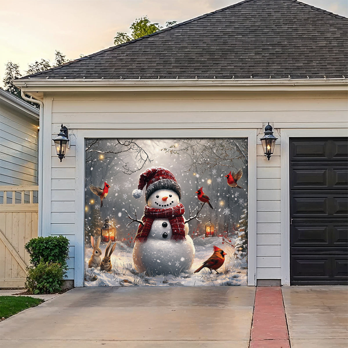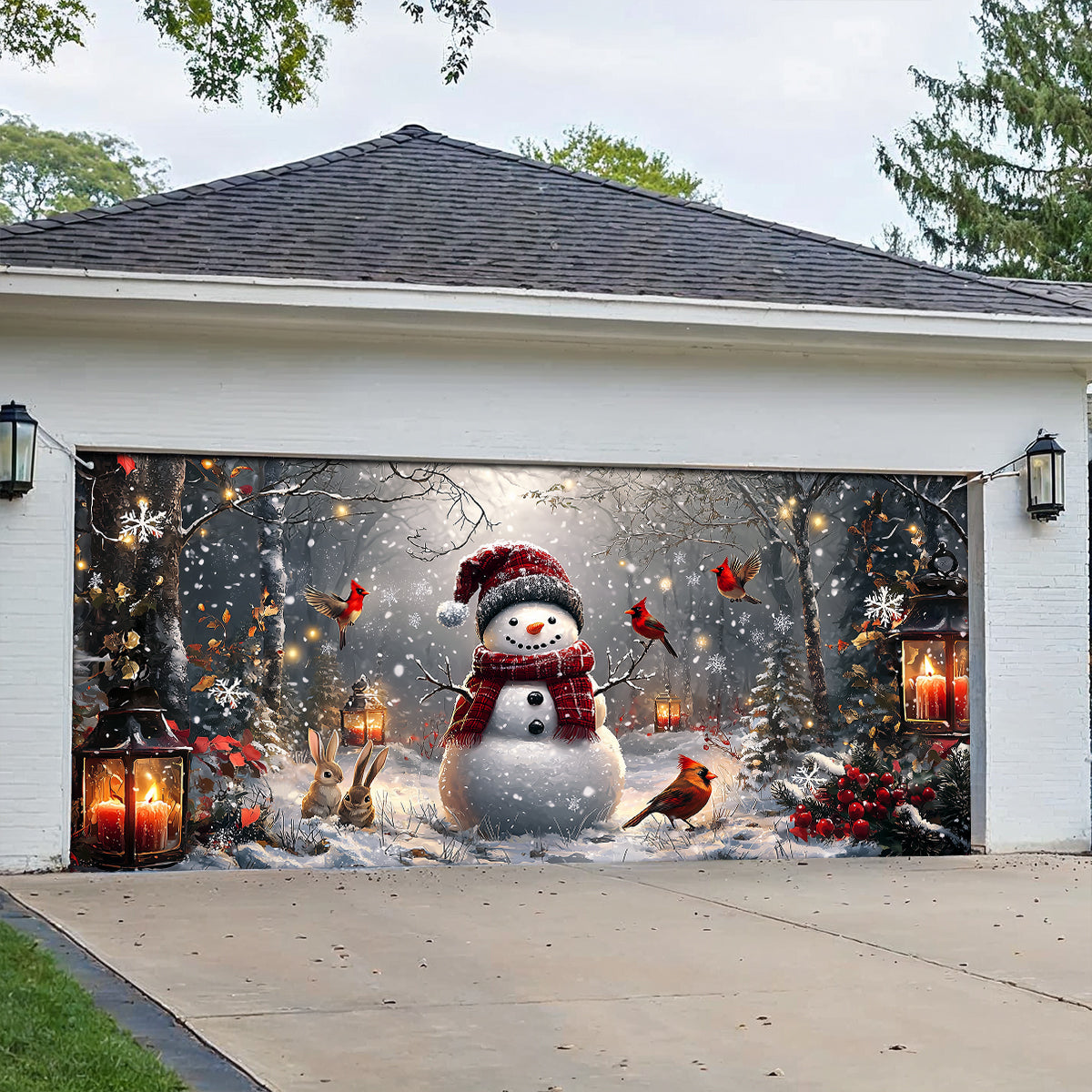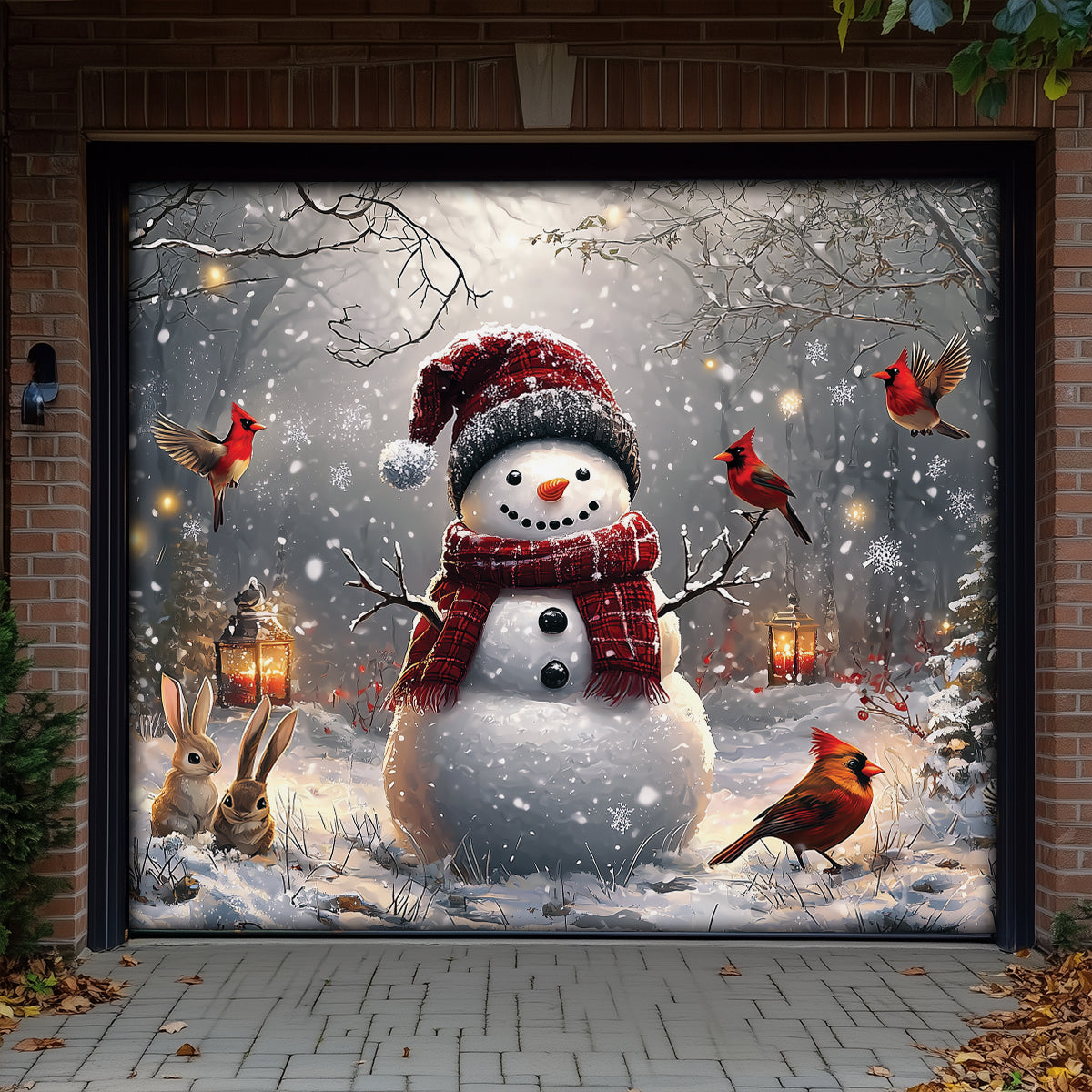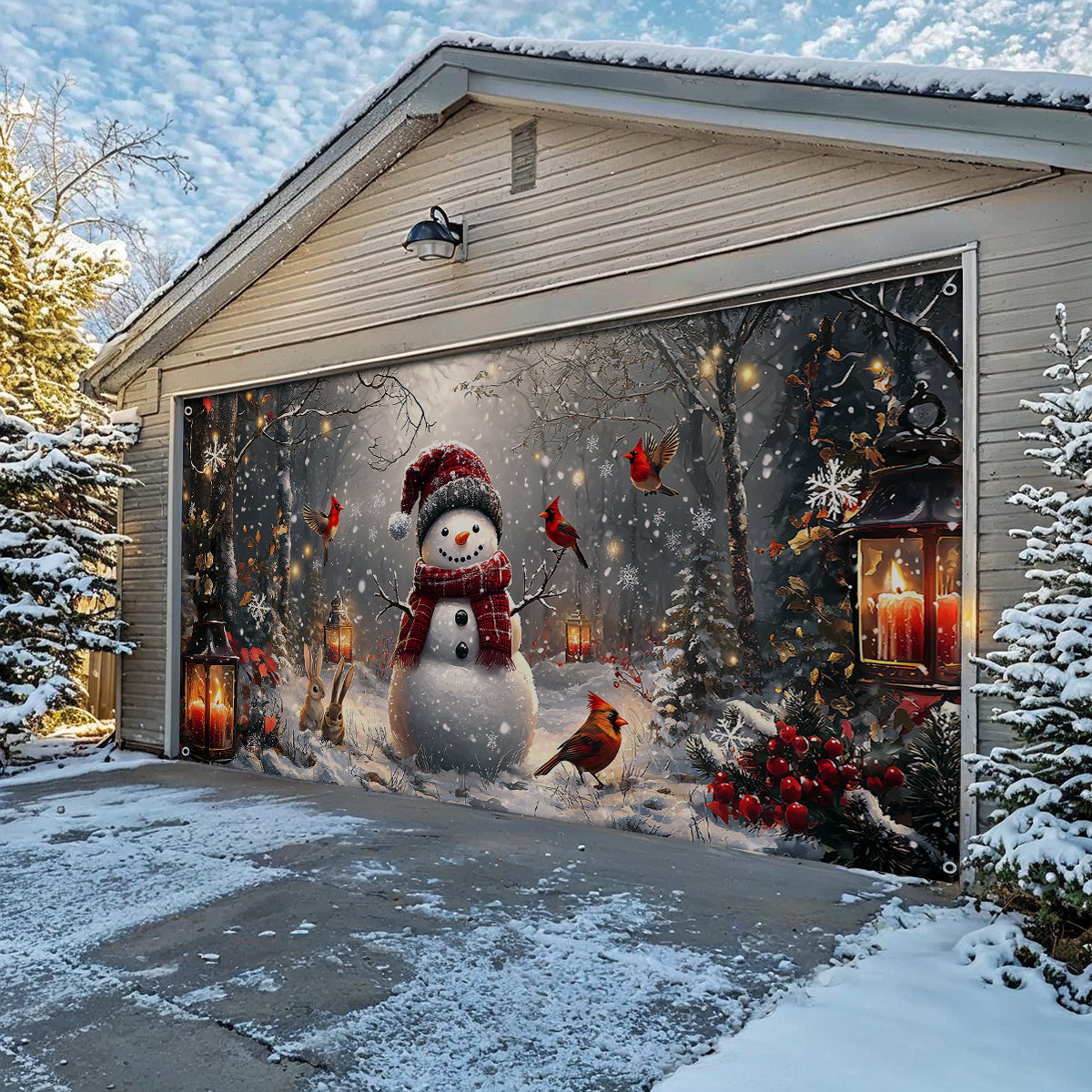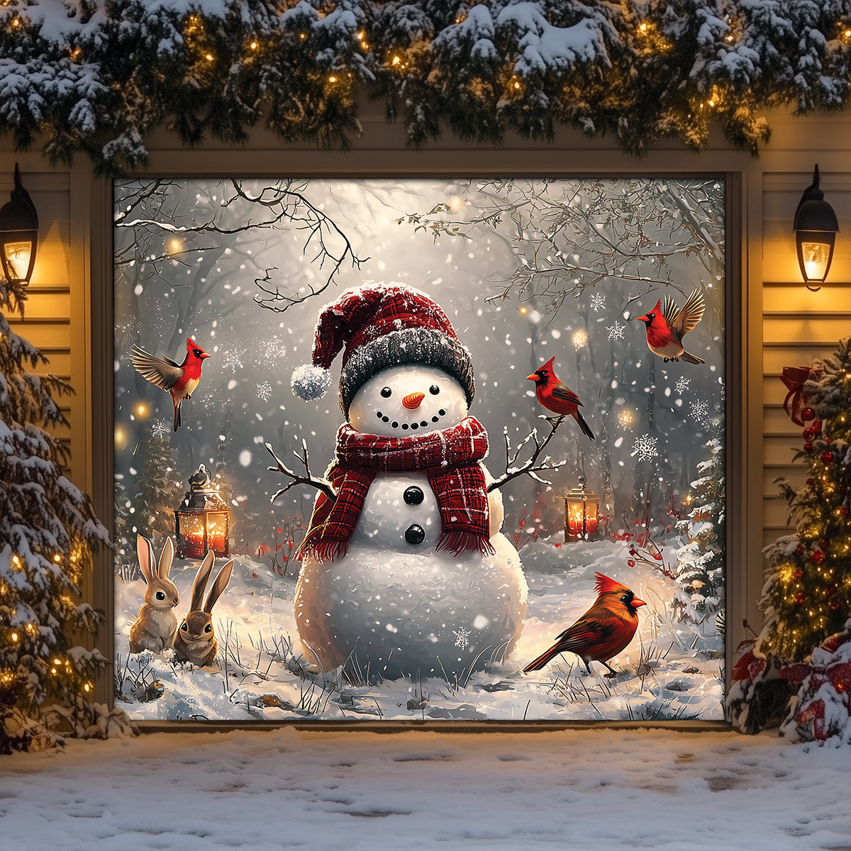 Shineful Garage Door Banner Decoration Winter Forest Snowman With Cardinals