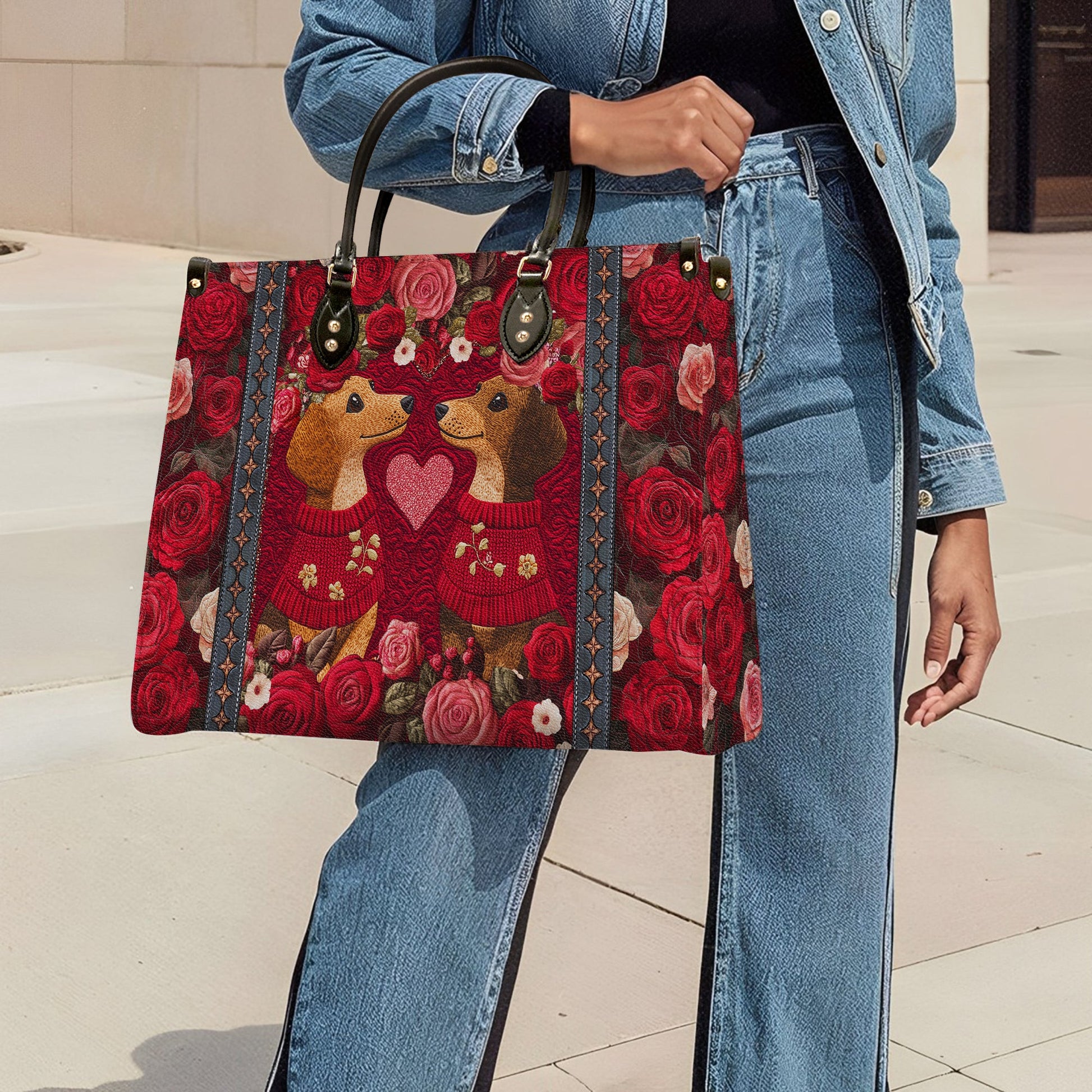 Shineful Leather Bag Heart Floral Dachshund Couple