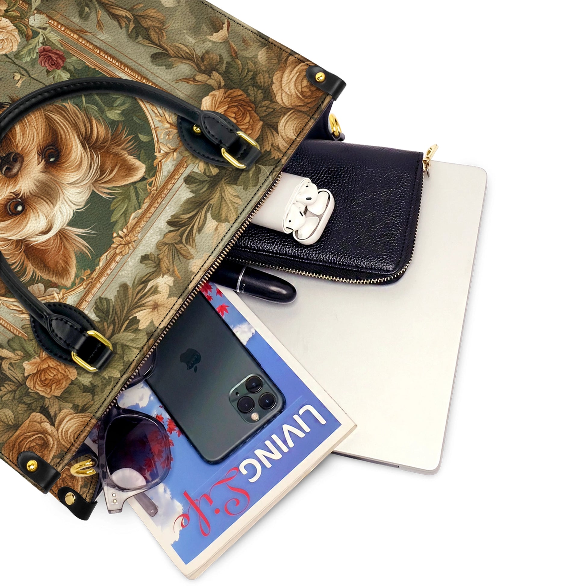 The Yorkie’s soulful eyes and finely detailed fur bring warmth and charm, making it the heart of the artwork. Surrounding the portrait, intricate roses and lush foliage in muted earthy tones—soft gold, deep green, and warm beige—create a timeless, elegant aesthetic. The rich, baroque-style frame enhances the regal and artistic appeal of the design, evoking a sense of classic sophistication. Crafted from premium leather, the bag offers both durability and luxury, with black leather handles and gold-tone hardware adding a refined touch.