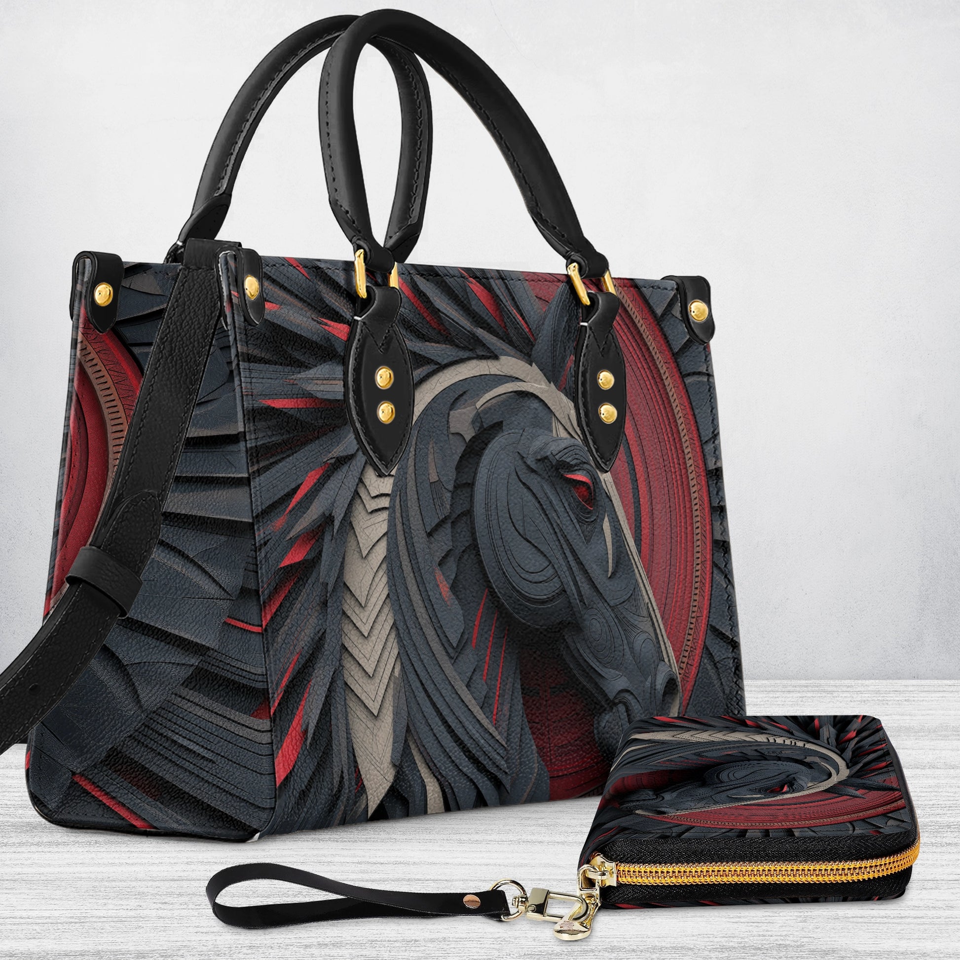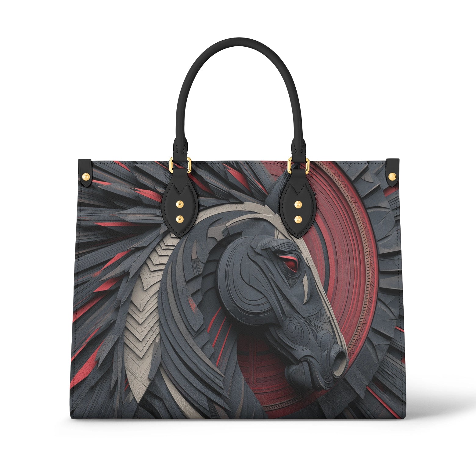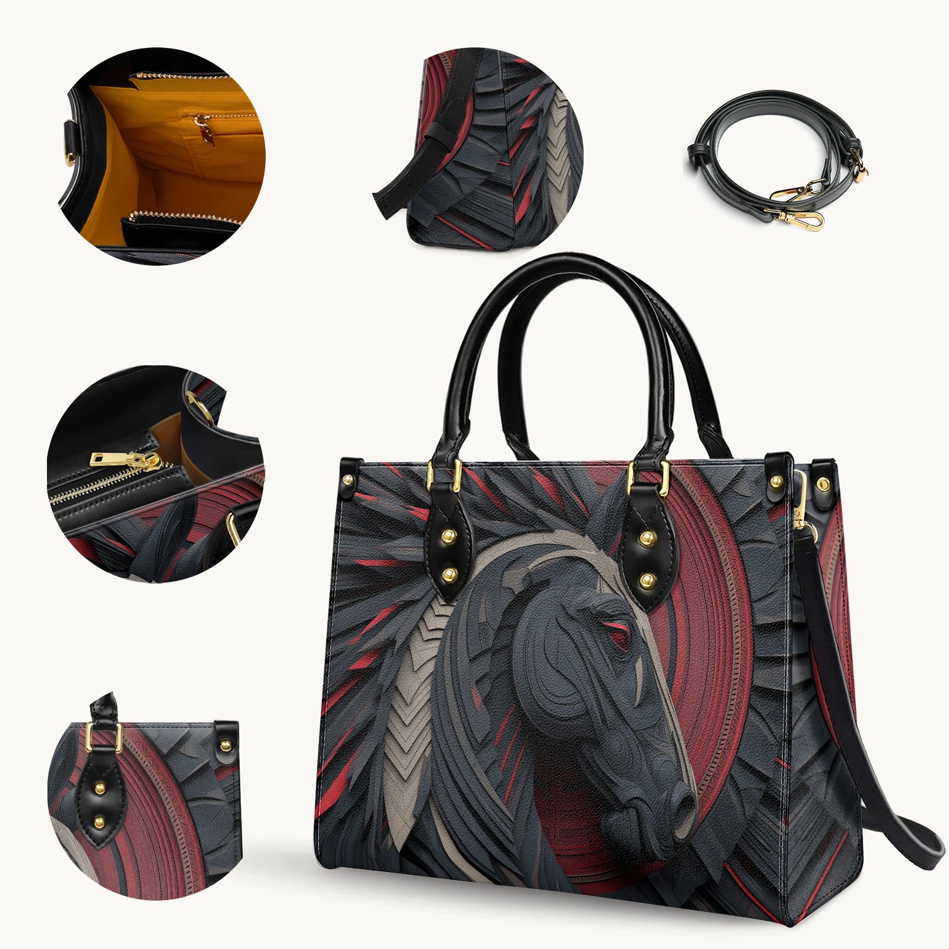 This leather bag features a commanding horse portrait crafted with deep layered textures and dramatic contrast. The sculpted mane radiates outward like armor, blending matte charcoal tones with sharp crimson accents that evoke strength, control, and dominance.