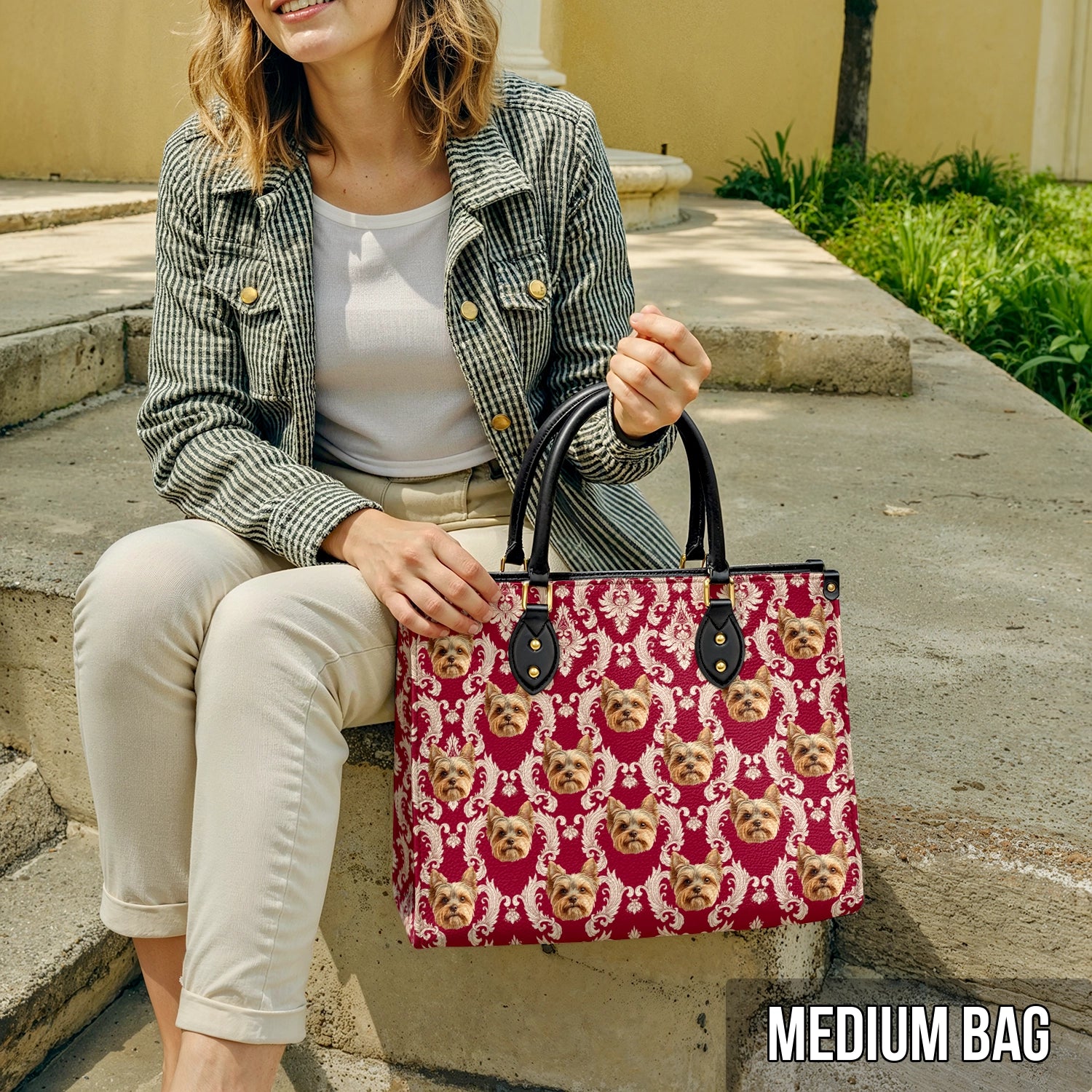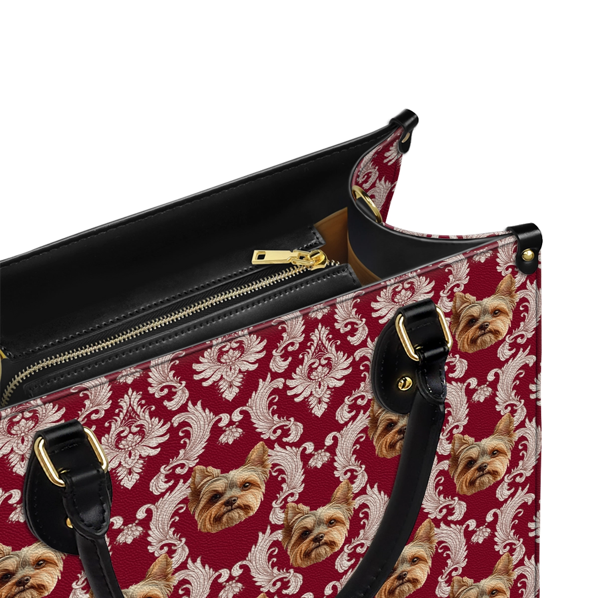 Each Yorkie portrait is finely detailed, capturing their expressive eyes and signature silky fur, radiating warmth and charm. The symmetrical damask-inspired design, in soft beige and gold tones, adds a regal touch, enhancing the vintage aesthetic. The contrast between the vibrant red and ornate flourishes creates a timeless, sophisticated appeal. Crafted from premium leather, the bag offers durability and a high-end finish, complemented by black leather handles and gold-tone hardware.