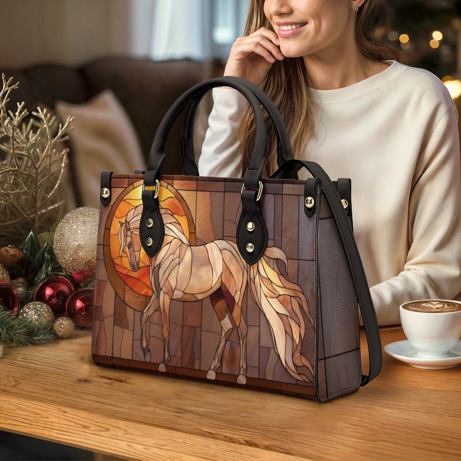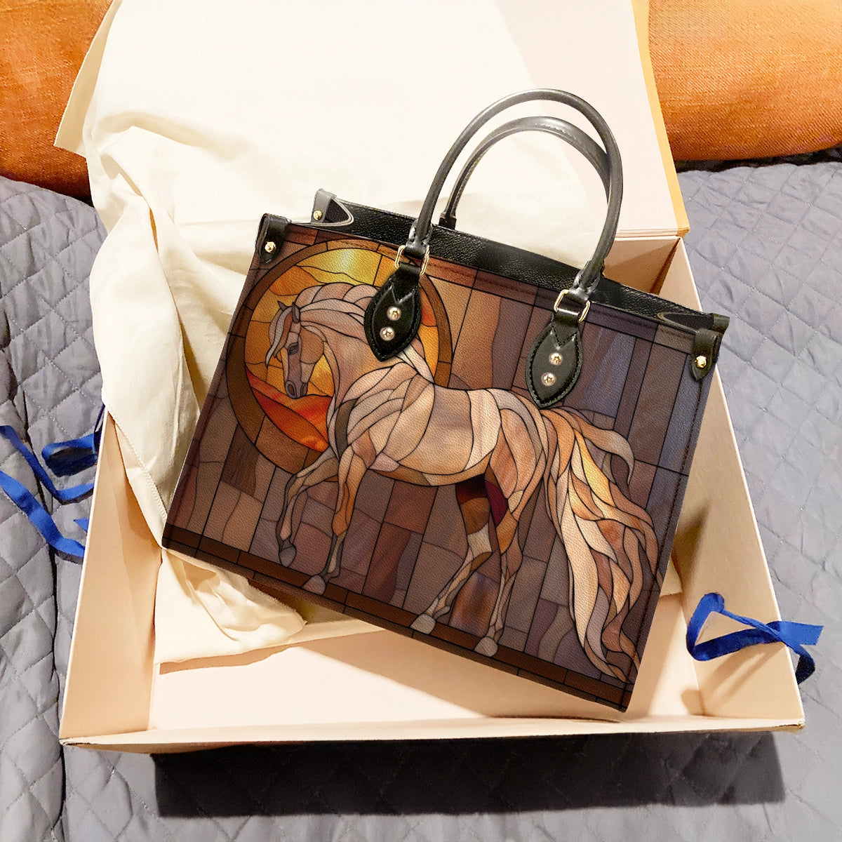 This leather bag features a serene horse rendered in a stained-glass–inspired composition, surrounded by warm amber and bronze tones. A glowing circular halo behind the horse evokes a sense of calm, balance, and quiet strength, while layered panel textures give the artwork a handcrafted, architectural feel.