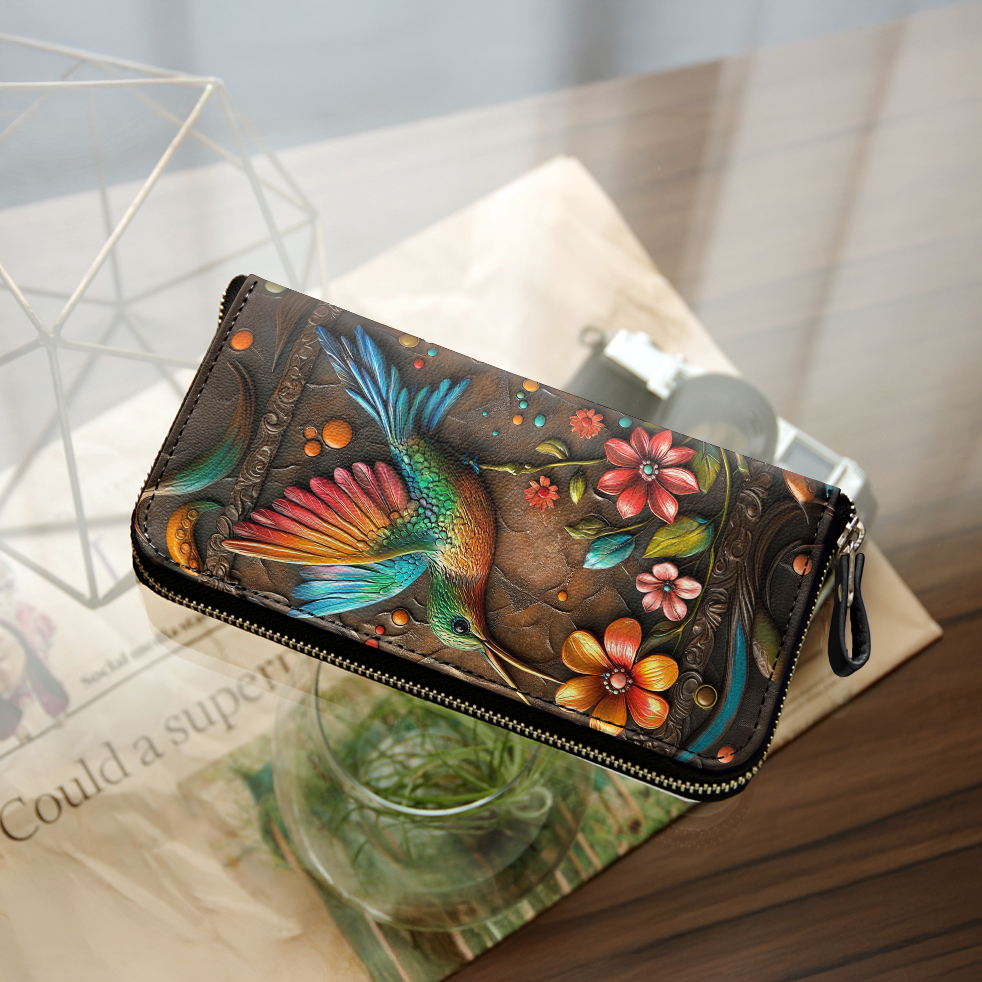 Shineful Leather Clutch Purse With Wristlet Strap Handle Hummingbird And Flower