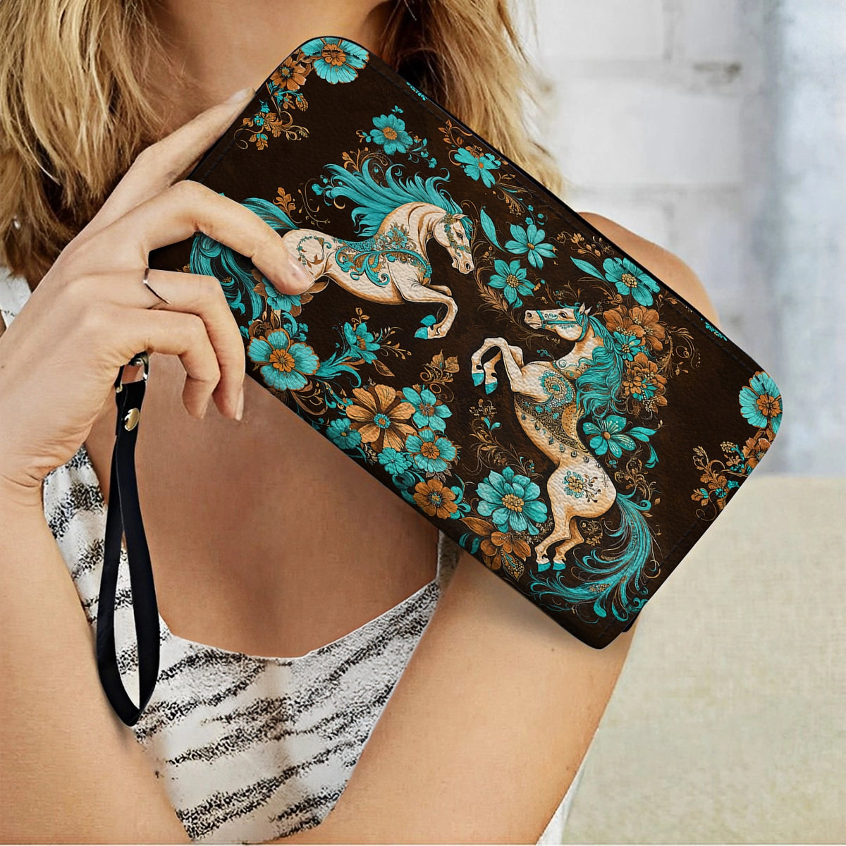 Shineful Leather Clutch Purse With Wristlet Strap Handle Mystic Horse Blossom