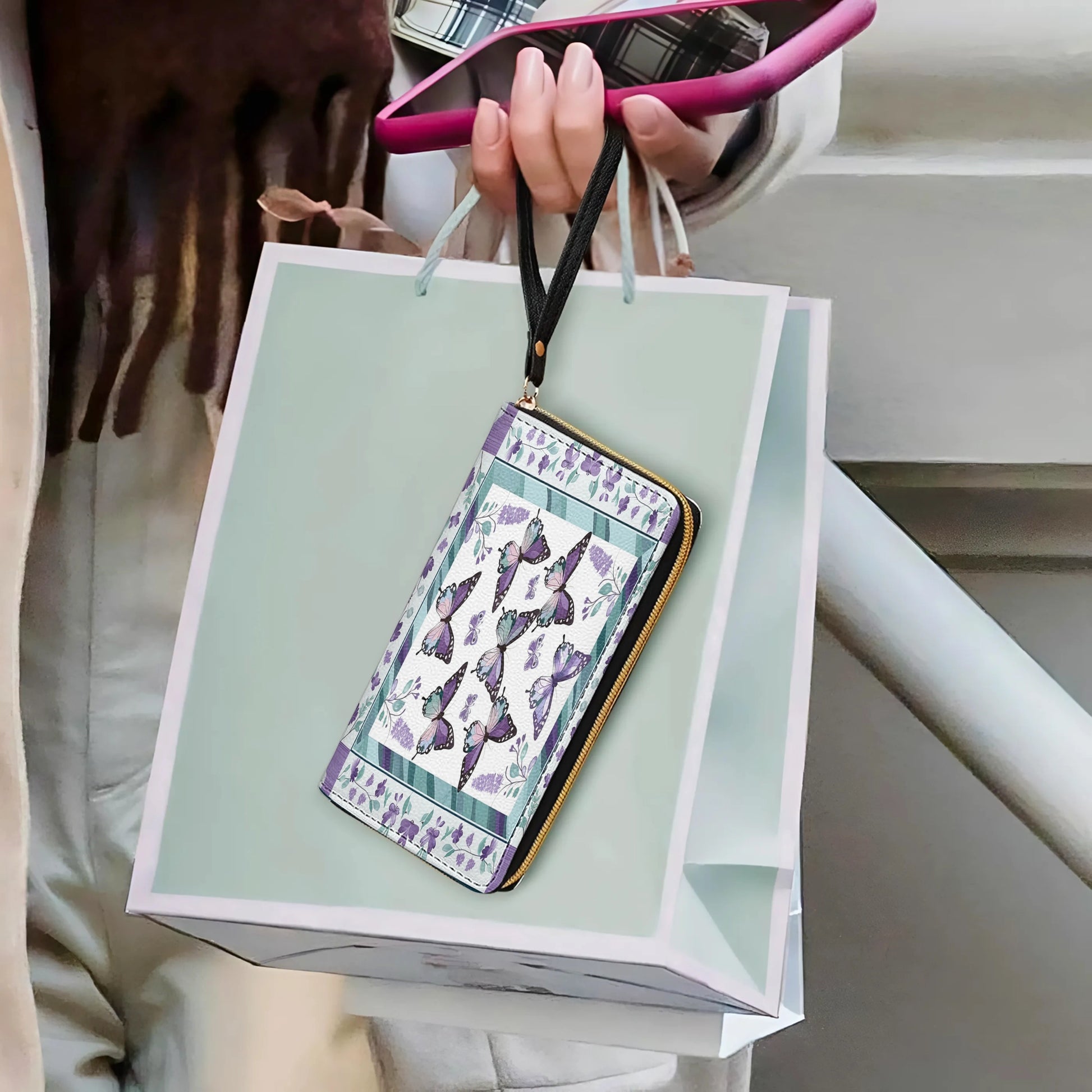 Shineful Leather Clutch Purse With Wristlet Strap Handle Purple Butterfly & Floral